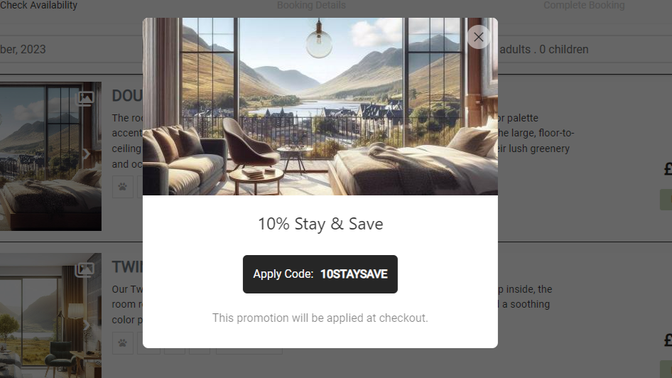 More Direct Bookings: Prevent Customer Drop-off by Presenting Enticing Discounts - Boost Direct Bookings - The 'Stay and Save' Feature: Activated by a user's inactivity during the booking process, this feature, which can either pop up or slide in based on your preference, appears after a predetermined duration of inactivity that you can set. It displays a special offer, like a 5% discount code, directly on the booking page, encouraging immediate use for completing reservations.